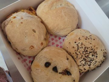 Four mini loafs -flavors are original, chocolate chip, fairy (sprinkle bread) and everything