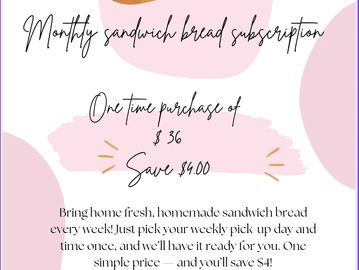 Enjoy homemade sandwich bread on a weekly basis. Select your preferred pick-up day and time once, and receive your fresh loaf each week. Pay a single price and enjoy $4 in savings.